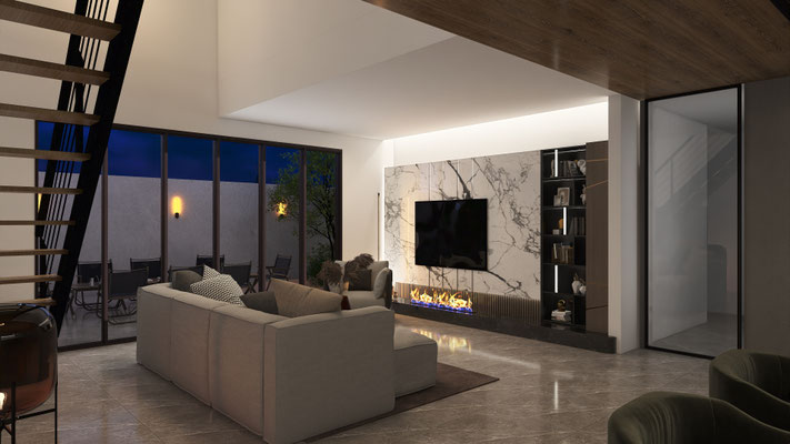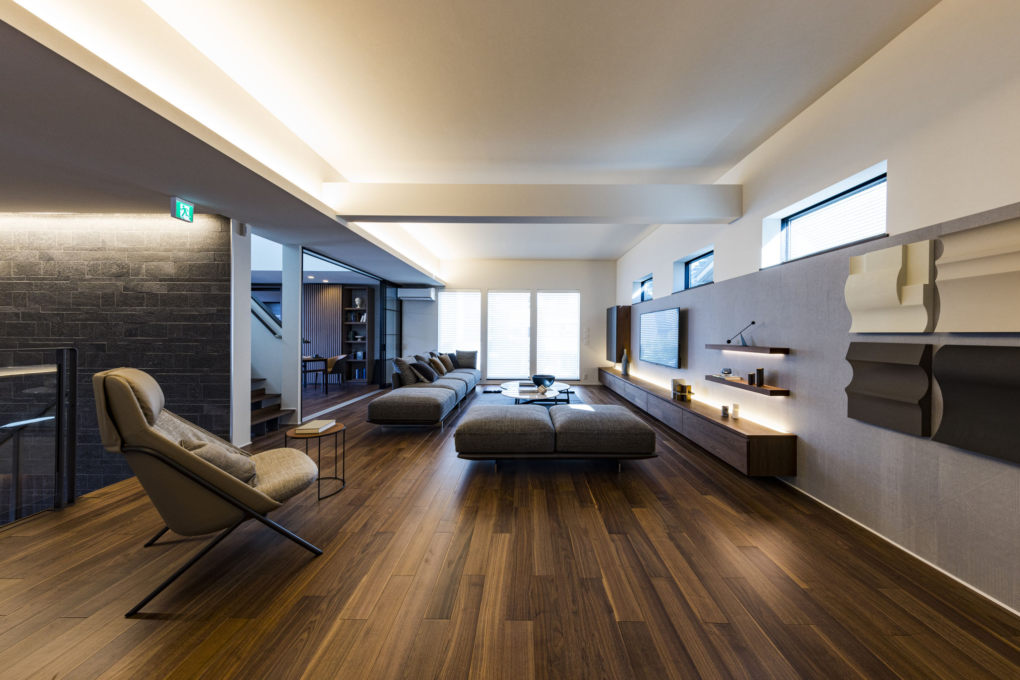 ソファを中心に据えたレイアウトは、家族が自然と集まり、語らいが生まれる“場”を意識。素材のコントラストではなく“質感”で奥行きを出し、控えめな照明計画が心を穏やかに整えます。