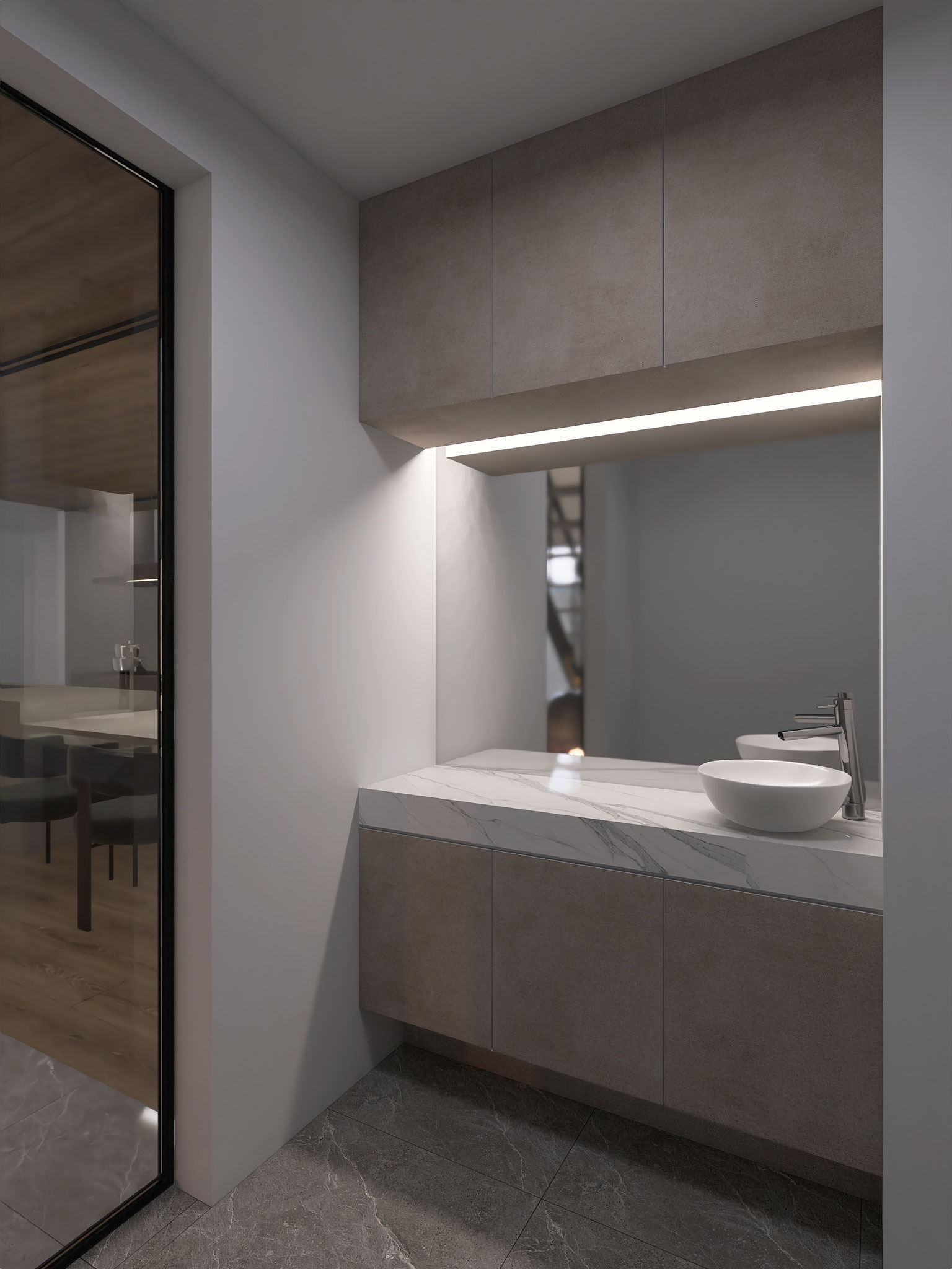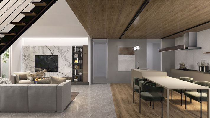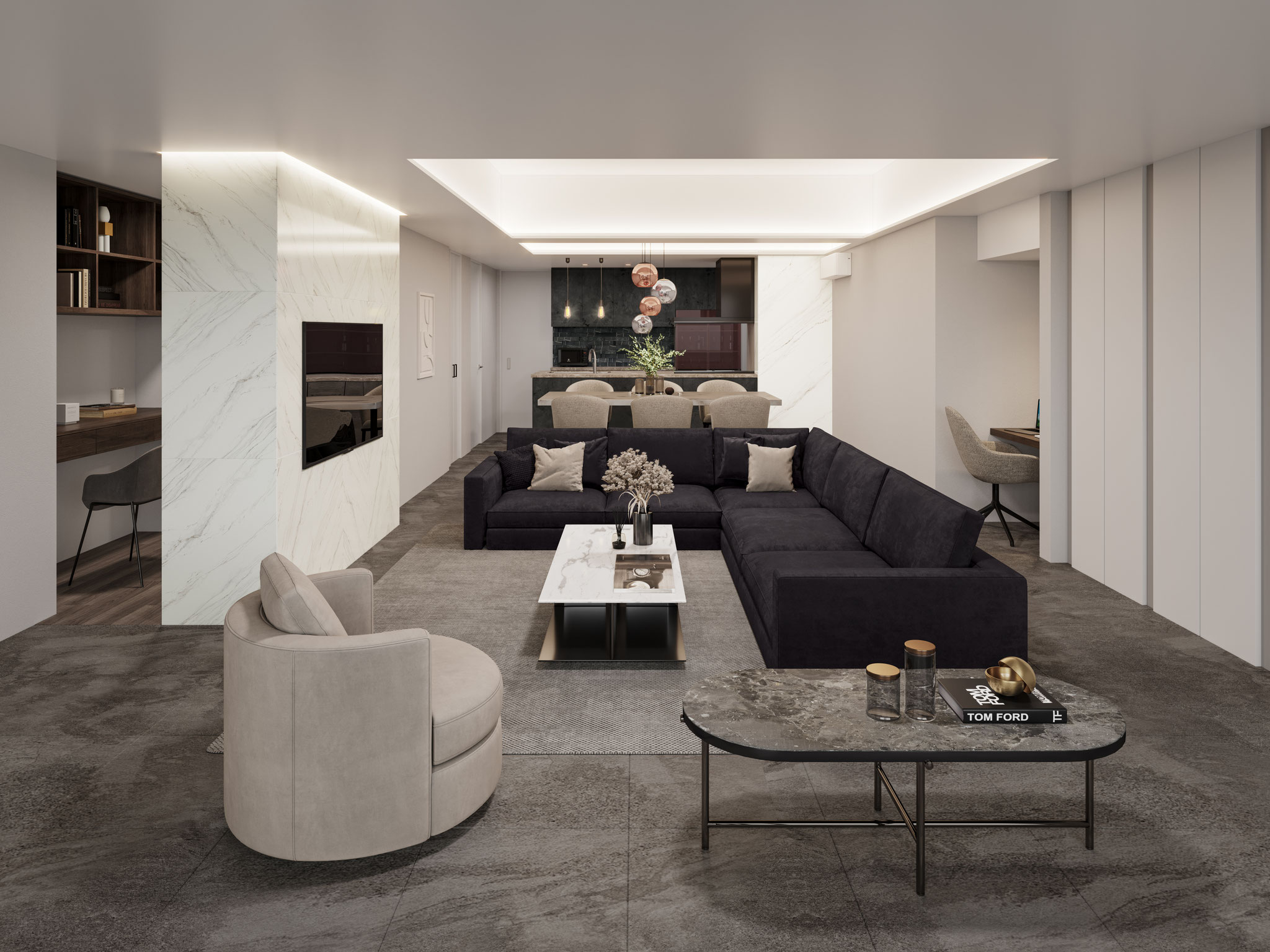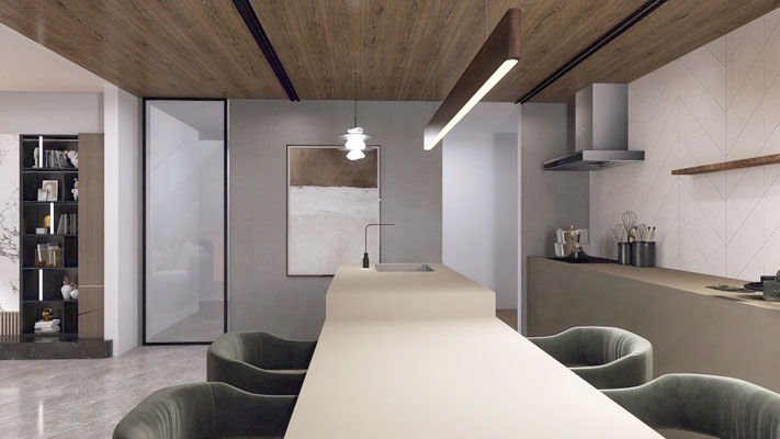 マテリアルは、マーブル、木、金属の質感を調和させ、どこにいても「素材の存在」が感じられるよう設計しました。