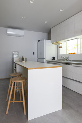 リビング・キッチン・中庭がひとつながりになることで、視線の抜けと空間の広がりを演出しています。造作キッチンは生活感を抑えたデザインに仕上げ、ダイニングと連続するようレイアウト。