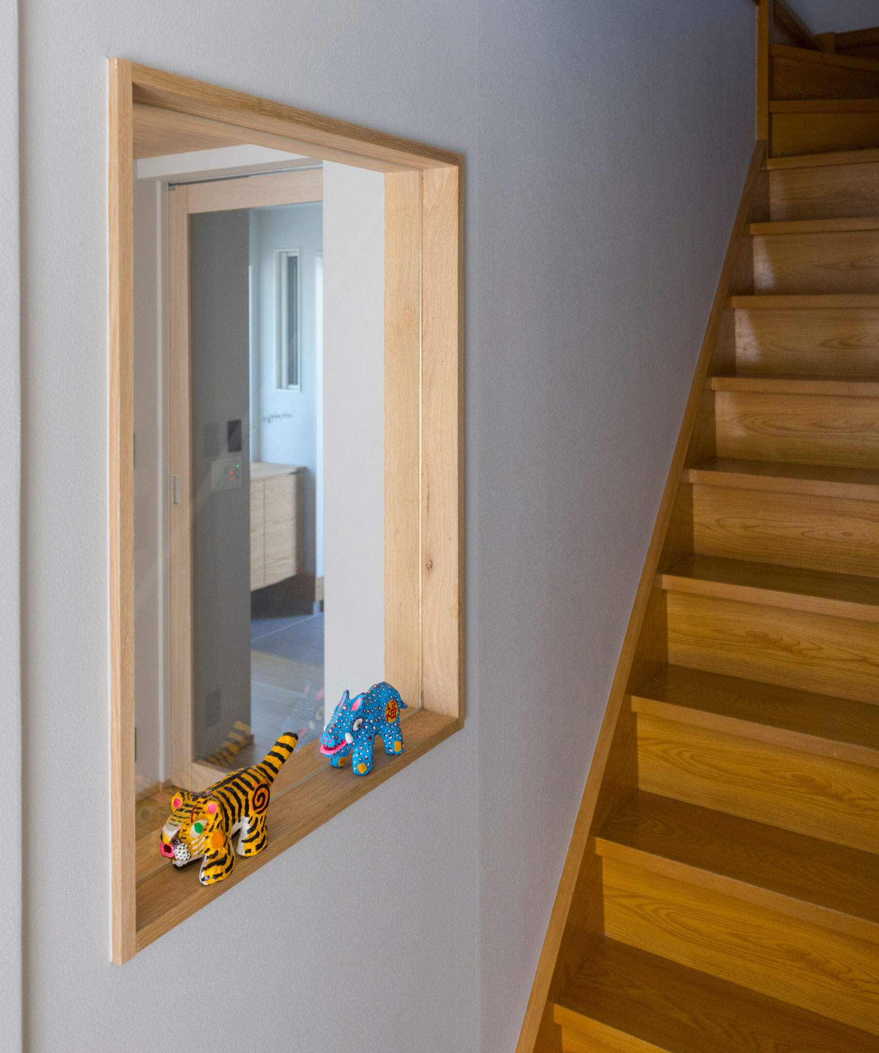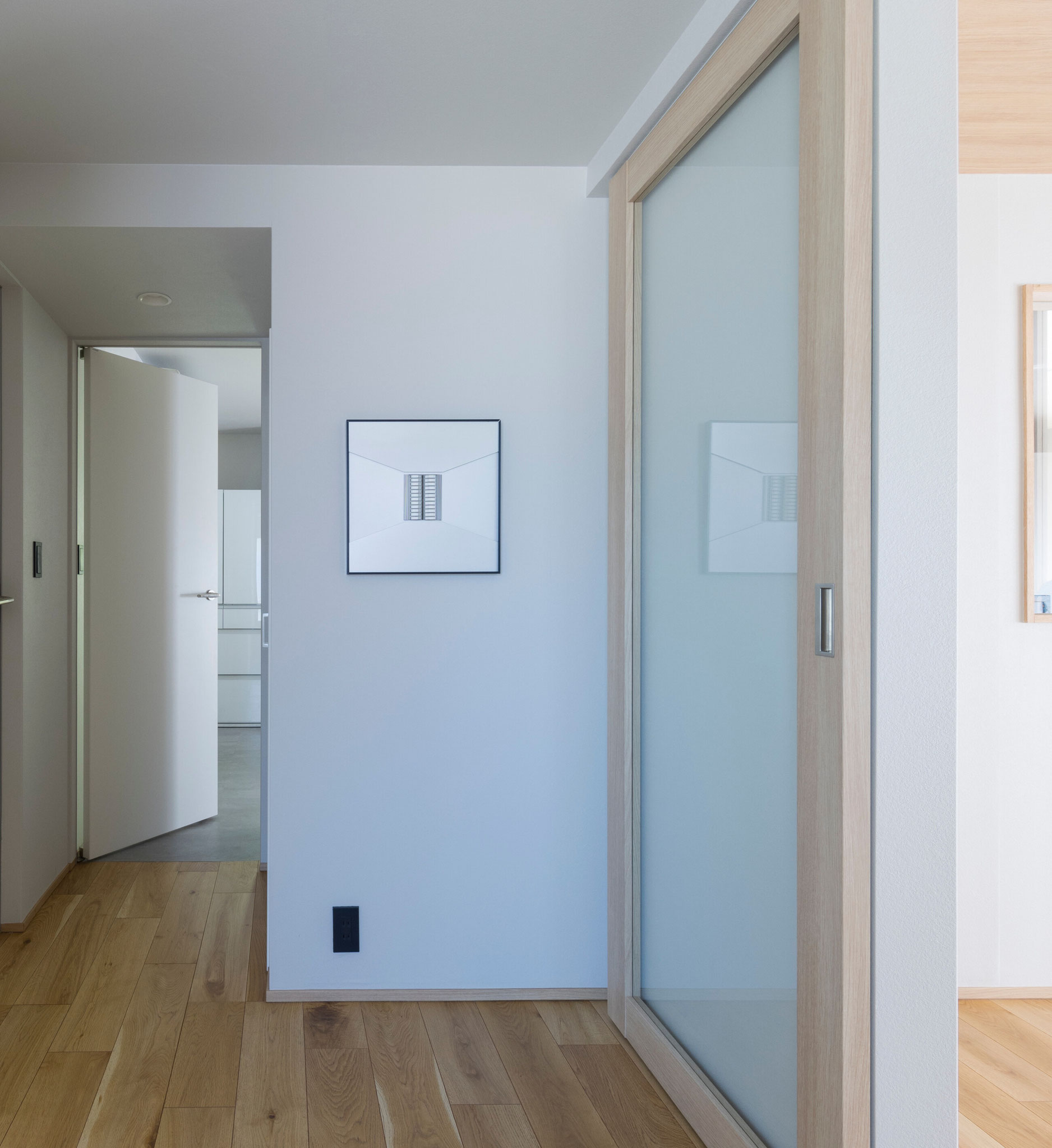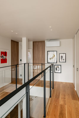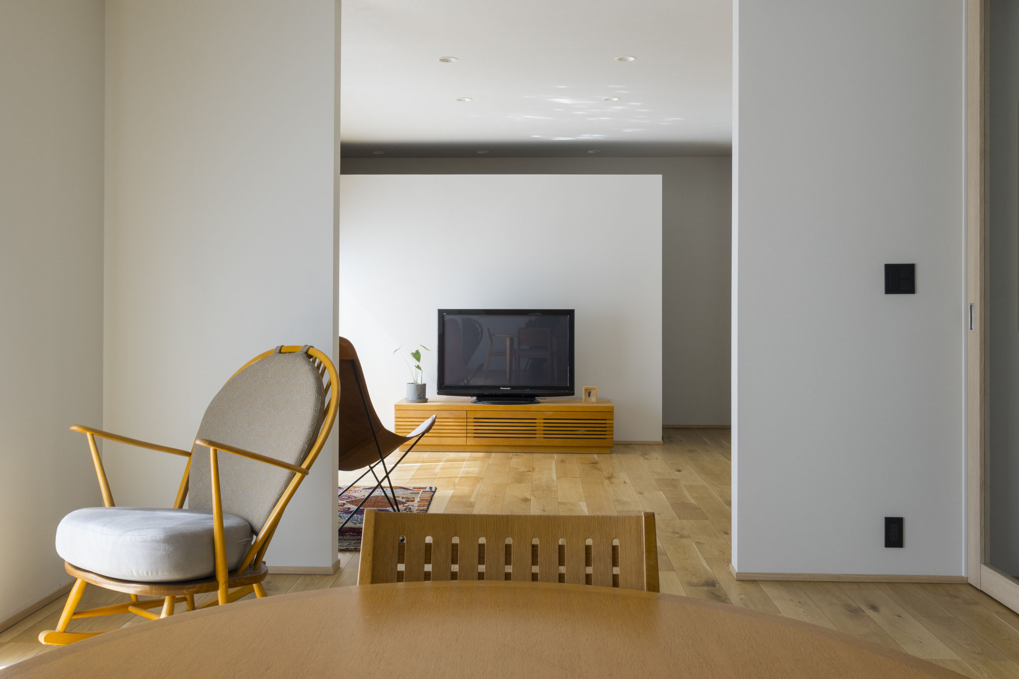 家に打ち合わせに訪れるたび、テーブルの上には旬の単行本が置かれていました。本を愛し、日々の時間を大切にする暮らしがいつも垣間見えていた気がします。壁にかかるバング&オルフセンのスピーカーから流れる音楽が、その静かな営みを包み込んでいました。この住まいは、2×4工法の制約の中で、できるだけ開放的な空間をつくりたいという思いから始まりました。固定的なレイアウトを避け、自由に過ごせる空間を目指し、ソファを置かずに一人掛けのチェアを点在させることとしました。それぞれが気分や時間帯に応じて居場所を選び、暮らしに小さな発見をもたらせるように。家族が思い思いの場所で過ごしながらも、どこかで緩やかにつながっている。そんな住まいのかたちを描きました。