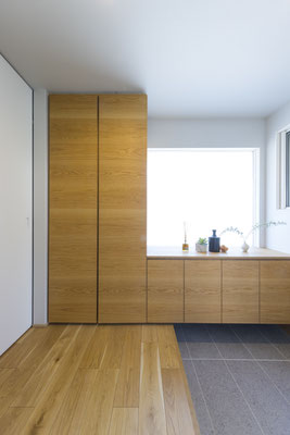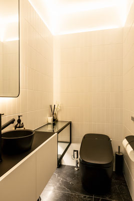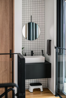 マテリアルは、オイル塗装を施したオーク材、マットなブラック、グレイッシュなタイル。これらの素材をミニマルに構成し、単調にならないよう、陰影やテクスチャのバリエーションを重ねています。