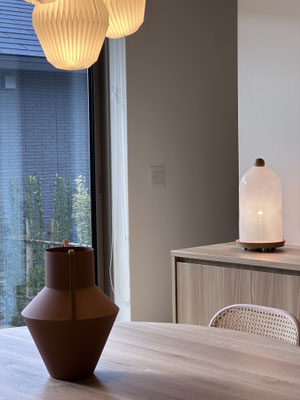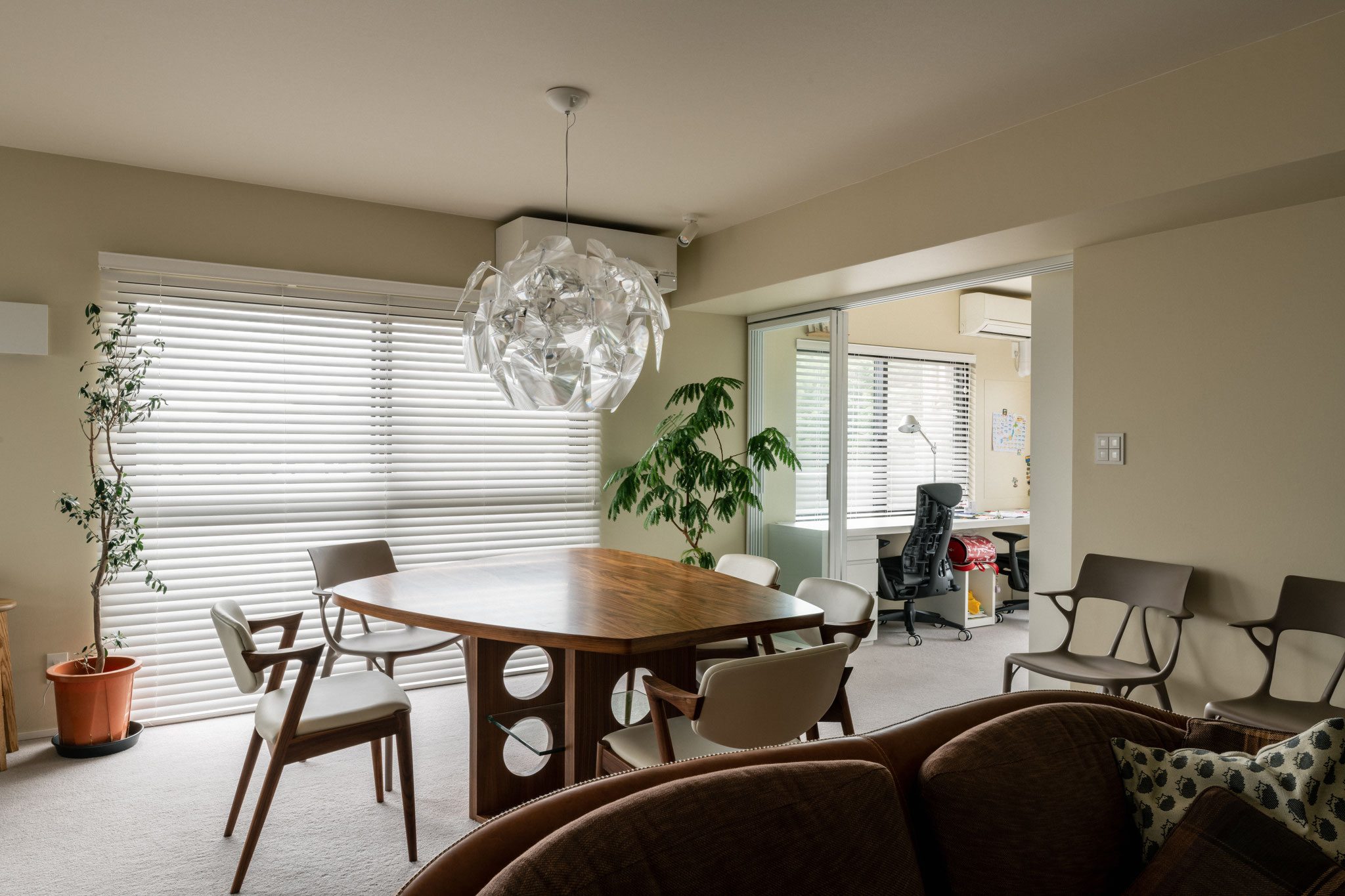 ベージュの壁とカーペット、アールを描くダイニングテーブルや丸みのある家具が、空間をやわらかくしています。どことなくクラシカルな雰囲気の中に、クライアントが選ばれたシャンデリアがきらめき、自然光とともに季節の移ろいが映し出されて空間に躍動感を添えたのがよかった。やさしい素材感に包まれて、日々の暮らしに穏やかな心地よさをもたらしてほしい、そう思っています。